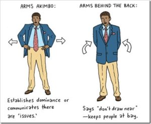 A zsebre tett, illetve az öv vonalát kiemelő kéztartás minden esetben dominanciát jelez, ellenkező nemek esetén pedig szexuális érdeklődést.